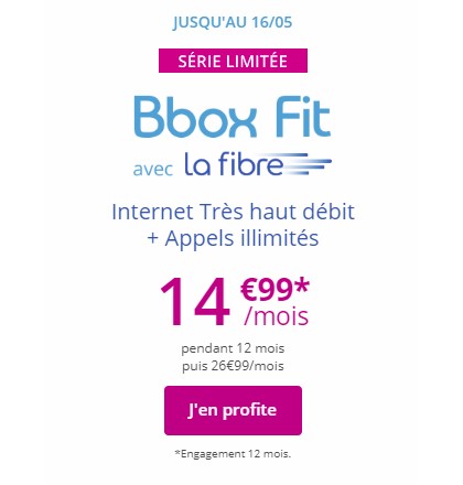 Avec son offre Internet, vous ne bénéficiez pas d'un prix fixe mais d'une belle remise mensuelle de 12€ par mois. En effet, l’opérateur Bouygues Telecom vous permet avec sa Bbox Fit de profiter du service qualité de Bouygues Télécom avec le très haut débit par la Fibre optique au prix bas de 14.99€ par mois. Ce tarif exceptionnel inclut l'essentiel à savoir l'accès Internet à grande vitesse et la téléphonie illimitée. A l'issue de la période promotionnelle, cette Bbox Fit en version Fibre à prix réduit repassera à son tarif habituel de 26,99€ chaque mois.