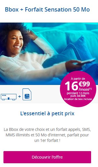 Une Box Internet et un forfait appels, SMS, MMS illimités + 50Mo d’Internet, le tout pour moins de 20€, c’est possible avec Bouygues Telecom ! En effet, le FAI et opérateur mobile vous propose en ce moment un pack incluant la BBOX Fit et le forfait Sensation 50Mo à petit prix la première année (14.99€/mois pour la Box + 2€/mois pour le forfait, soit 16.99€).