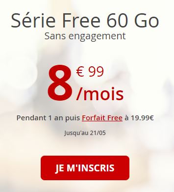 Valable jusqu’à aujourd’hui, la série Free Mobile sans engagement avec 60Go (débit réduit au-delà) est toujours proposée à 8.99€/mois la première année. Au terme de la première année, les abonnés passent sur un forfait Free à 19.99 €/mois qui donne accès à davantage de services encore !