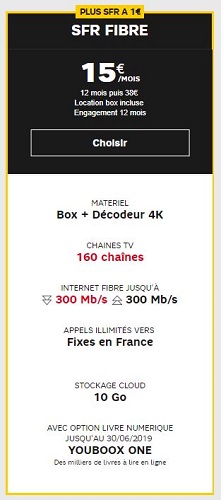 SFR offre une BOX Fibre triple-play pour seulement 15€/mois la première année (puis 38€/mois), avec engagement de 12 mois. Cette dernière donne accès à un décodeur 4K avec 160 chaînes TV, une connexion Internet Fibre (jusqu’à 300Mb/s en débit descendant et ascendant), un stockage Cloud de 10Go et la possibilité d’appeler en illimité vers les fixes en France.