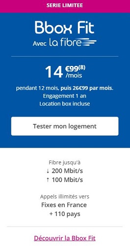 La BBOX Fit, soumise à un engagement de 1 an, comprend une connexion puissante (jusqu’à 200Mb/s en débit descendant et 100Mb/s en débit montant, ainsi que les appels illimités vers les fixes en France et vers plus de 110 pays internationaux.