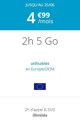 - Un forfait 2h 5Go utilisable en France, en Europe et dans les DOM, ainsi que les SMS illimités pour 4.99€ par mois à VIE