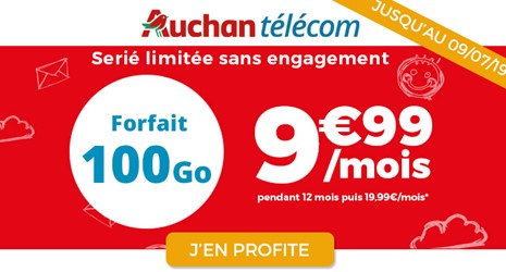 La nouvelle promo Auchan Telecom est valable jusqu'au 9 juillet inclus. Cette Série Limitée parfaite pour les gourmands de data comporte une enveloppe Web de 100Go à consommer en France ainsi que les appels, SMS et MMS illimités. Son prix est de seulement 9.99€ par mois la première année puis 19.99€ par mois. La remise de 10€ par mois durant une année est réservée aux nouvelles souscriptions avec le paiement de la carte SIM à 10€.
