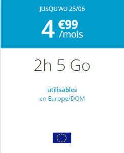 Les 5 Go de data et les 2 heures d’appels sont également utilisables dans les DOM et les autres pays d’Europe. Depuis ces zones, vous pourrez donc appeler la France métropolitaine, les DOM et les autres pays d’Europe, sans surcoût, dans la limite du forfait accordé. Pour ce qui est des SMS et MMS, ils sont offerts en illimité vers la France métropolitaine, les DOM et l’Europe pendant ces séjours.