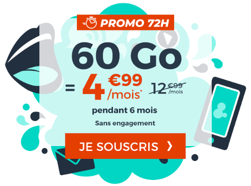 Voilà encore une autre promo avec un gros volume de data à petit prix qui pourrait vous intéresser. Ici, vous bénéficiez chaque mois de 60 Go/mois en 4G, avec débit réduit au-delà, ainsi que des appels, SMS et MMS illimités vers les numéros de tous les réseaux de France métropolitaine lorsque vous êtes en métropole.