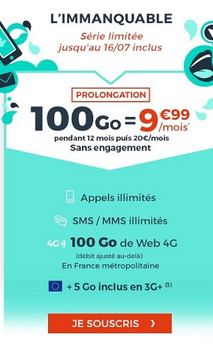 Cdiscount Mobile vient de prolonger la validité de sa série spéciale (jusqu’au 16 juillet), comprenant 100Go de data pour uniquement 9.99€ par mois pendant 1 an. Par la suite, ce forfait sans engagement passe à 20€ par mois.