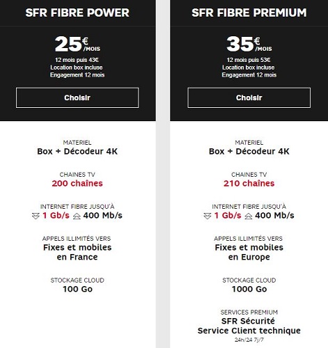 Du côté de l’offre Premium Fibre de SFR, on passe à 10€ de plus par mois, c’est-à-dire 35€ la première année (avec engagement de 1 an), puis 53€ par la suite. En plus d’un décodeur 4K, cette BOX comprend 210 chaînes TV, la même connexion Fibre optique que la BOX Power, les appels illimités vers les fixes et les mobiles en France ET en Europe, ainsi qu’un espace de stockage Cloud de 1 000Go.