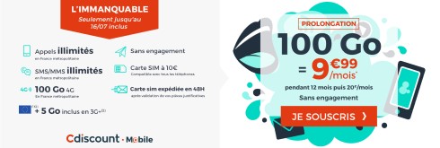 L'offre est disponible jusqu'au 16 juillet inclus et réservée aux nouveaux clients (portabilité). En souscrivant à Cdiscount, vous êtes affilié au réseau mobile Orange, SFR ou Bouygues Telecom. Sachez que le choix du réseau revient uniquement au MVNO en fonction de la zone géographique de l’abonné.