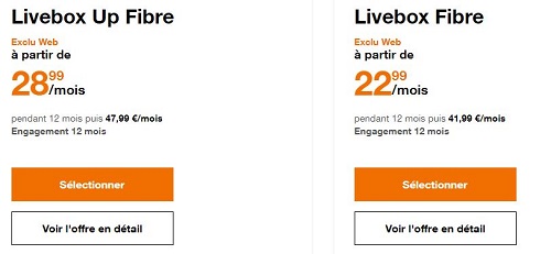 Orange vous propose des prix remisés la première année sur ses Livebox Fibre et Livebox Up Fibre jusqu'au 21 août 2019. En effet, la première est proposée en exclu web à partir de 22.99€ par mois pendant 12 mois, puis à 41.99€ par la suite (avec engagement de 12 mois). La seconde est quant à elle affichée à 28.99€ par mois la première année, puis 47.99€ par la suite.