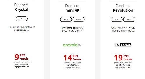 - La Freebox Crystal, à 9.99€ par mois la première année, puis à 24.99€ par la suite