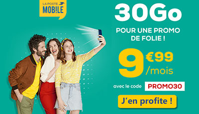 La Poste mobile innove avec un nouveau forfait pas cher à seulement 9,99€. Vous pouvez bénéficier de cette promo en ajoutant le code promo « PROMO30 » lors de votre souscription. Vous bénéficierez ainsi d’une réduction définitive de 5€ sur le forfait 30Go et ce, jusqu’au 18 septembre 2019. Pour ce tarif, vous profiterez des communications en illimités, appels, SMS, MMS vers et depuis la France métropolitaine, l’Union européenne et les DOM. En ce qui concerne l’enveloppe internet de 30Go, vous pourrez utiliser 10Go depuis les zones Europe, DOM et COM.