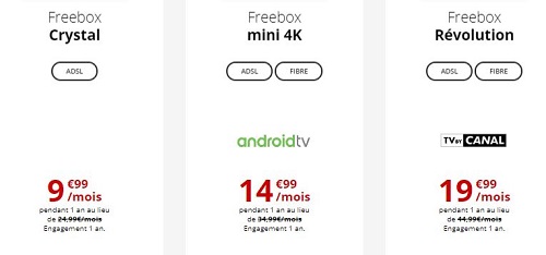 Jusqu’au 17 septembre, les Freebox Crystal, Mini 4K et Révolution sont en promo, respectivement proposées à 9.99€, 14.99€ et 19.99€ par mois pendant 1 an, puis à 24.99€, 34.99€ et 44.99€ par la suite.