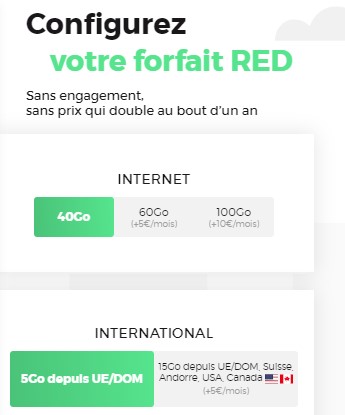 Pour 10€ par mois, ce nouvel abonnement RED comprend donc une enveloppe Web de 40Go par mois en très haut débit (4G, 3G) en France. Au-delà de 40 Go, l’accès à internet est bloqué jusqu’à la prochaine date de facturation. L'abonné peut toutefois ajouter une recharge internet moyennant 2€ par mois pour bénéficier de 1Go supplémentaire (4 rechargements maximum par mois, valables uniquement en France métropolitaine). Depuis l’Union Européenne et DOM, vous bénéficiez chaque mois de 5Go/mois. Au-delà des 5Go/mois, le Mo supplémentaire est facturé à 0,005€/Mo (facturation par ko).