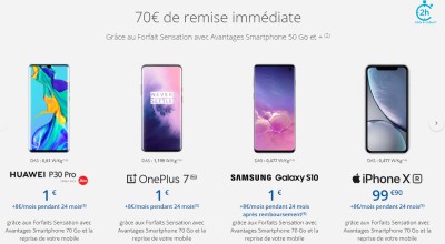 L’opérateur de Martin Bouygues profite des French Days pour proposer aux français de nombreuses promotions, et notamment 70€ de remise immédiate sur de nombreux téléphones portables, pour la souscription d’un forfait Sensation avec Avantages Smartphones ou d’un abonnement de gamme supérieure et la reprise de votre ancien mobile. Le renseignement du code promo « BOUYGUES70 » est nécessaire lors de votre commande.