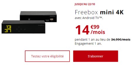 La Freebox Mini 4K sous Android TV en promo à 14.99€ par mois puis 34.99€ met à disposition une connexion Internet Fibre (jusqu'à 1Gb/s en débit descendant et jusqu'à 600 Mb/s en débit montant). Cete offre est aussi proposée en ADSL ou VDSL pour les zones non couvertes par la Fibre Free. Pour la téléphonie, cet abonnement inclut les appels émis vers les fixes de plus de 110 destinations dont la France et les DOM. Concernant la TV, les clients profitent de l'univers Freebox TV avec plus de 220 chaînes et un accès VOD. Les clients profitent aussi d'un accès Google Play, pour entrer dans un monde de contenus et d’applications.