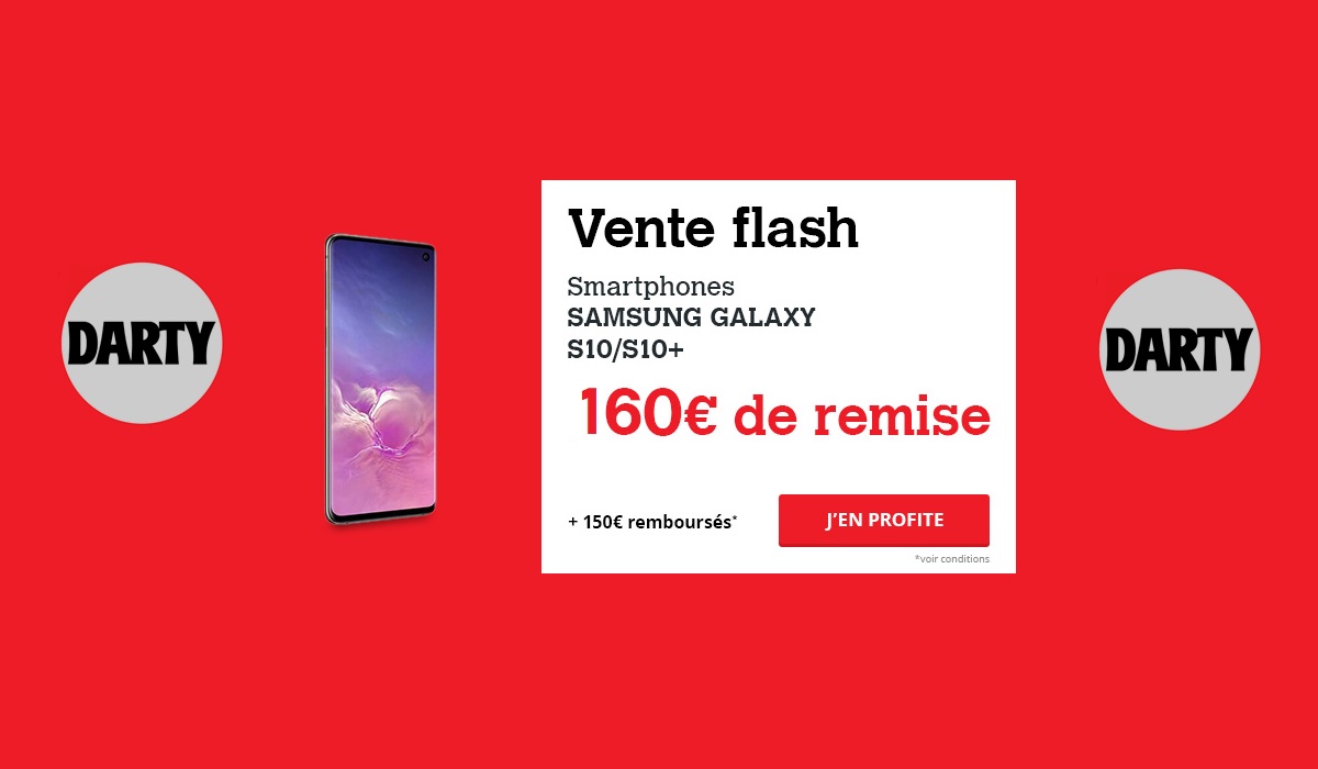 Comme à son habitude, Darty gâte les clients en cette fin de semaine en affichant de multiples ventes, flash, promotion, ou offres de rembousrement. Ici sur les Samsung Galaxy S10 et S10+ avec une capacité de 128Go, nous retrouvons non seulement une vente flash avec remise immédiate de 160€, mais également, une offre de remboursement de 150€ pour tout achat d'une paire de Galaxy Buds (oreillettes). Voici les arifs avec les 2 remises déduites :