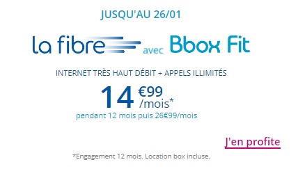 Il s’agit ici de la Série Limitée Bbox Fit Fibre à 14.99€ la première année puis 26.99€ par mois. Pour moins de 15€ et un engagement de 1an, les clients disposent de :