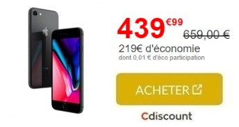 Vous cherchez un bon plan pour vous procurer l'iPhone 8 ? Profitez de l'offre proposée chez Cdiscount dans le cadre du Black Week, le marchand vous octroie une remise de 219€. Grâce à ce rabais exceptionnel, l'iPhone 8 passe au prix canon de 439.99€ au lieu de 659€. Pour les petits budgets, le cybermarchand propose le paiement en 4 fois avec une première mensualité de 112.63€ à verser à la commande puis 3 fois 112€.