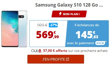 Pour mettre la main sur le Samsung Galaxy S10, Rakuten est le mieux placé ce week-end. L'enseigne vous propose en effet le dernier flagship du géant Sud Coréen au prix canon de 569.99€. Pour profiter de ce bon plan, vous devez choisir le Galaxy S10 128Go en blanc. L'appareil est vendu neuf et expédié depuis le Royaume-Uni en 6 à 12jours. Notez que les membres du club Rakuten profitent d'un bon d'achat de 57€ à valoir sur leurs prochaines commandes.