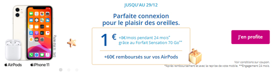 RED by SFR offre un double bon plan pour acquérir l’iPhone 11. Tout d’abord l’opérateur offre le prix initial le plus bas de marché : 789€ contre 809€ pour les autres enseigne. En plus de ça, RED by SFR offre jusqu'au 6 janvier 2020, 100€ de réduction pour tout mobile de plus de 500€ et pour toute souscription au forfait sans engagement 60Go. L'iphone 11 est donc présenté à seulement 689€ si vous êts déjà abonné RED ou si vous souhaitez le devenir.