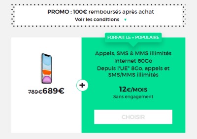 La remise sur demande de 100€ sur l'iPhone 11 est valable pour les abonnés RED ou avec l'achat d'un forfait RED. Les nouveaux clients ont donc la possibilité de profiter de ce bon plan iPhone 11 à 689€ en l'associant à un forfait RED 60Go à 12€ par mois à VIE. Ce forfait phare sur le marché du sans engagement est actuellement en promo à 12€ par mois au lieu de 15€ jusqu'au 6 janvier 2020 inclus.Ce prix avantageux est valable sans condition de durée autrement dit vous en profiter jusqu'à la résiliation. Avec ce forfait pas cher vous profitez chaque mois :
