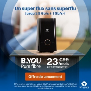 Mentions légales : Jusqu’à 8 Gb/s en téléchargement et jusqu’à 1Gb/s en envoi pour les clients éligibles avec option Débit + gratuite sur demande, sous réserve d'éligibilité et d'équipement compatible (avec module ou carte 10G) branché en filaire. Jusqu’à 2 Gb/s et 900 Mb/s pour les clients non-éligibles à cette option. Débits partagés entre équipements branchés en filaire (jusqu’à 1 Gb/s équipement en cas de boîtier de terminaison optique externe) et en WiFi. Déploiement en cours. Test d’éligibilité et conditions sur bouyguestelecom.fr.