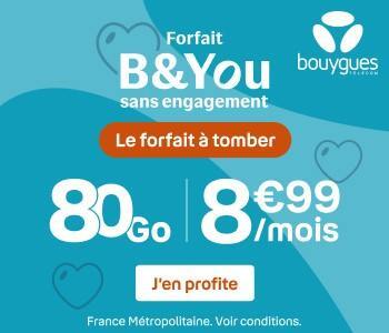 En ce moment, Bouygues Telecom vous propose de réaliser une belle affaire : prendre un forfait mobile B&You 80 Go pour seulement 8,99 € par mois. Eh oui, en saisissant cette proposition, vous profiterez d’une grande enveloppe internet pour un tarif vraiment bas !