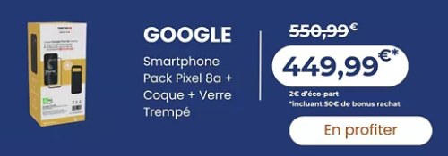 Profitez des French Days chez Boulanger pour acquérir le Google Pixel 8a, un smartphone alliant design moderne et fonctionnalités haut de gamme. Actuellement proposé avec une remise de 60 €, accompagné d’un bonus de 50 € lors de la reprise de votre ancien mobile, son prix final s'élève à 449,99 €. Cerise sur le gâteau, une coque de protection et un verre trempé vous sont offerts en cadeau.