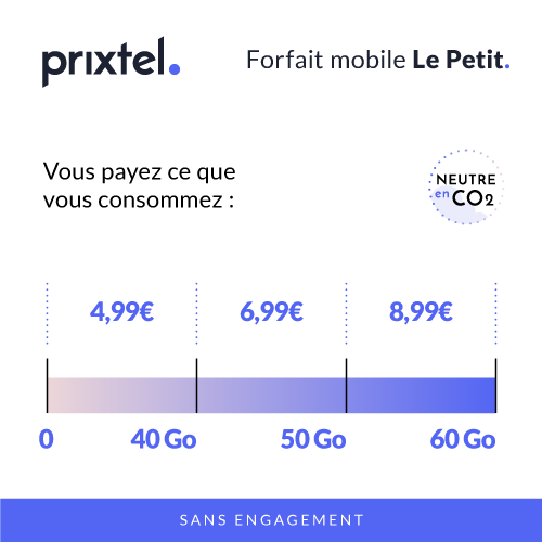 L’un des points forts du forfait Le petit, c’est son côté respectueux de l’environnement. En effet, alors que l’utilisation d’un abonnement mobile peut générer 30 kg de dioxyde de carbone (CO2) par an, l’offre de Prixtel est neutre en CO2.