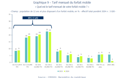 Selon l'étude, en 2024, 69 % des abonnés à un forfait mobile ont souscrit un forfait mobile pas cher (moins de 20 € par mois). Cette proportion est stable par rapport à l'année précédente (+1 point) et, très logiquement, plus importante encore chez les jeunes : plus de 8 abonnés sur 10 chez les moins de 18 ans.