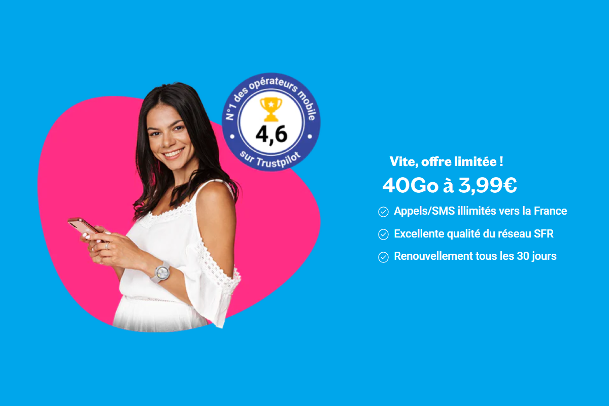 En plus de son petit prix, ce forfait mobile permet de voyager en toute sérénité, avec une enveloppe de données généreuse à l’étranger. L’opérateur virtuel s’appuie sur la qualité du réseau Bouygues Telecom, avec un service 100 % en ligne.