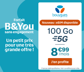 Cerise sur le gâteau : la carte SIM ou l’eSIM ne vous coûtera que 1 €. Alors que d’autres opérateurs facturent la puce physique ou virtuelle une dizaine d’euros, Bouygues Telecom vous permet ainsi d’activer votre forfait B&You 100 Go 5G pour un montant très réduit. Finalement, il n’y a que du bon avec cette formule : complète, moderne et économique.