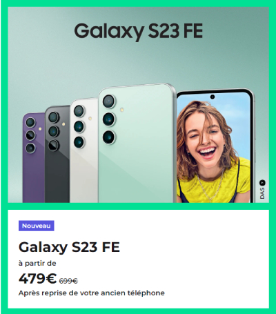 Si vous cherchez un bon plan pour vous procurer le tout dernier Galaxy S23 FE ? On a trouvé pour vous un super combo pour acheter ce smartphone récent du géant sud-coréen à prix mini. L'offre est proposée chez RED by SFR avec jusqu'à 220€ d'avantages possibles. Bénéficiez en effet d'un remboursement exceptionnel de 150€ dont la remise différée de 70€ par le constructeur et la possibilité de récupérer 70€ dans le cadre de la reprise, ce qui ramène le prix du Galaxy S23 FE à partir de 479€. La condition pour profiter de cette offre avantageuse est de souscrire à un forfait RED sans engagement et de restituer votre ancien smartphone. En cas de non-restitution de l'ancien smartphone, le Galaxy S23 FE reste disponible à 549€ au lieu de 699€ grâce aux deux ODR de 70€ par Samsung et 80€ par RED.