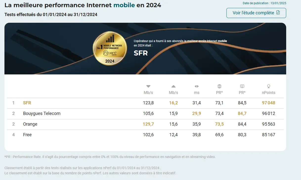 Cette année, SFR a renforcé sa position grâce à une politique d’investissement soutenue dans le déploiement de la 5G et l’amélioration globale de son réseau mobile. Les mesures indépendantes réalisées par nPerf, spécialiste reconnu des tests de réseau, confirment que SFR est aujourd’hui le meilleur opérateur sur le marché français en termes de qualité de service.