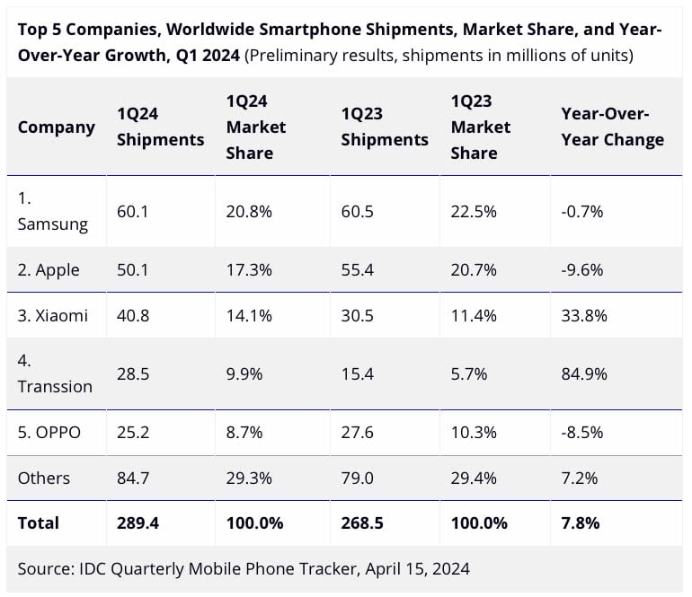 Samsung a donc repris sa première place sur le podium. Et c'est certainement lié à l'arrivée sur le marché des Galaxy S24 et de la nouvelle technologie Galaxy AI. en effet, le constructeur coréen a vendu pas moins de 6,54 millions de Galaxy S24 !