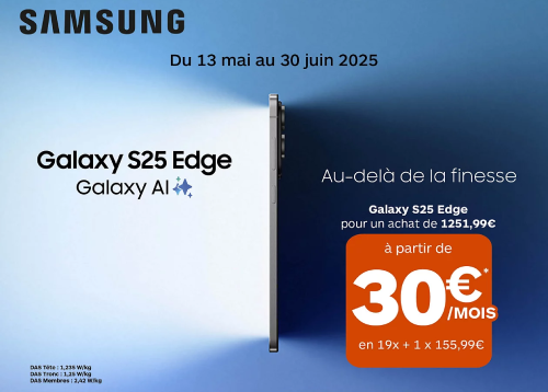 En reprenant l’exemple du Galaxy S24 Ultra 512 Go, le plan de financement pour l’achat d’un Samsung Galaxy S25 Edge à 1251,99€ est le suivant : 155,99€ + 19 mensualités de 30€.