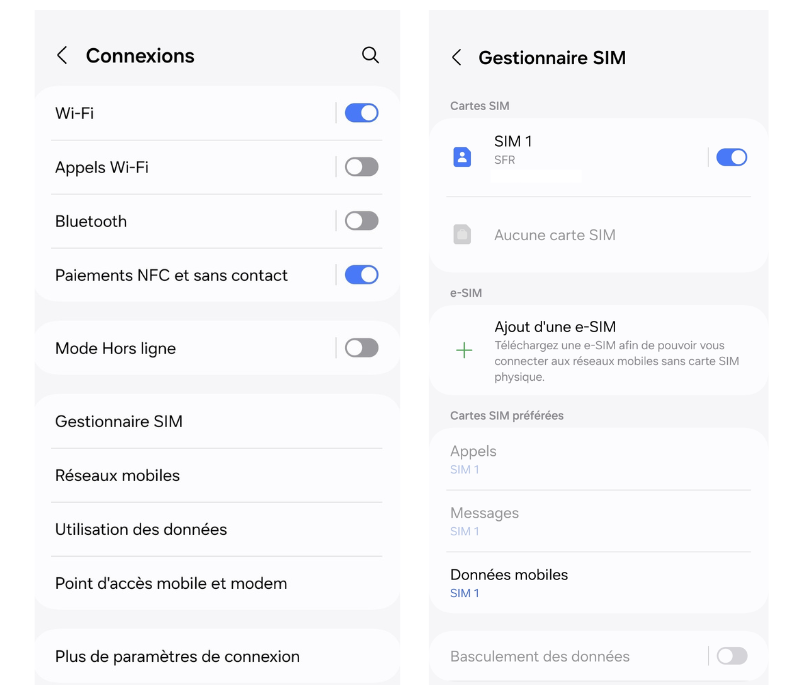 Pour activer votre carte eSIM depuis un téléphone Android, la marche à suivre est simple : allez dans Paramètres / Connexion / Réseau et Internet ou Réseau mobile ou encore Gestionnaire SIM.