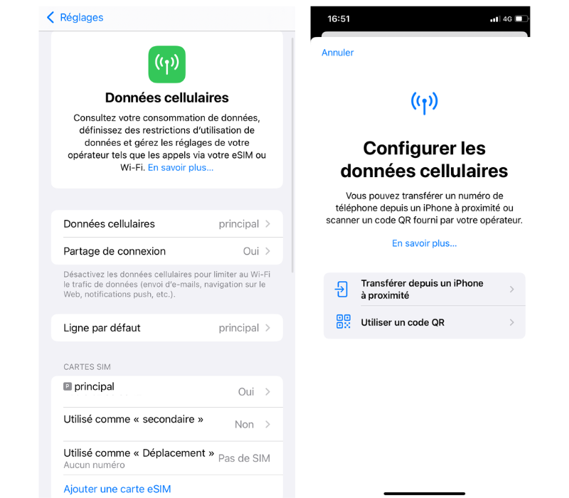 - si vous aviez déjà une carte eSIM dans votre ancien iPhone, vous pouvez transférer votre forfait dans votre nouveau terminal ;