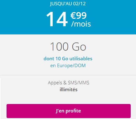 Bouygues Telecom baisse également le prix de son forfait 100Go à l'occasion du Black Friday. Affichée jusque-là au prix de 19.99€ par mois, cette offre connectée est désormais affichée à 14.99€ par mois et pas seulement la première année. Cet abonnement mobile en promo répond aux gros consommateurs de data avec ses 100Go autorisés chaque mois jusqu'en 4G en France. L’opérateur octroie également 10 gigas, déduits de l’enveloppe de base, pour surfer sur la toile en Europe et DOM. Cet abonnement connecté permet aussi de joindre ses proches sans compter dans l’hexagone mais aussi lors de vos séjours en Europe et DOM (les MMS émis à l’étranger sont décomptés des 10Go).