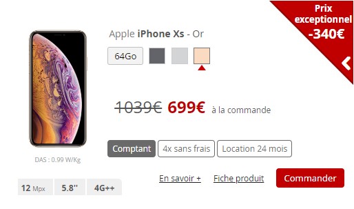Enfin, la marque Apple elle aussi est mise à l'honneur chez le quatrième opérateur car l'iPhone XS affiche un prix exceptionnel remisé de 340€, ce qui le met au prix de 699€ au lieu de 1039€ pour la version 64Go