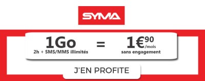 Si vous cherchez seulement un petit prix, Syma propose un forfait mobile tout à fait correct pour seulement 1,90€/mois. Ce prix est valable sans aucune condition et sans engagement. Il inclut 1Go pour assurer une navigation internet depuis la France dont 700Mo sont valables depuis l'Europe et les DOM. Vous pourrez bénéficier de 2h d'appel tandis que les SMS et les MMS sont illimités en France et dans les DOM mais aussi depuis l'Europe.