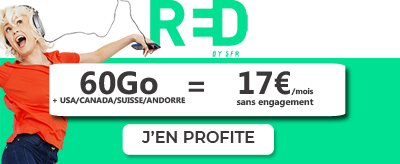 L’abonnement RED by SFR 60Go avec option internationale est quant à lui affiché à 17€/mois à VIE au lieu de 20€ jusqu’au 2 mars 2020. Ce forfait est dédié aux consommateurs qui ont tendance à partir souvent en voyage. En effet, il offre non pas 8Go mais 15Go depuis l’Union Européenne, les DOM, la Suisse, Andorre, le Canada et les Etats-Unis !
