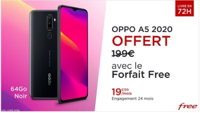 Free Mobile vient tout juste de lancer sa vente privée Free Mobile. Contrairement aux deux autres promos affichées sans engagement de durée, cette offre Free en vente privée est soumise à un engagement de 24 mois et les clients profitent d'un Smartphone offert. Le quatrième opérateur offre en effet le Oppo A5 2020 d'une valeur de 199€ pour toute commande de son forfait phare avec 100Go facturé chaque mois 19.99€ ou encore avec la 4G illimitée à 15.99€ par mois pour les clients Freebox.