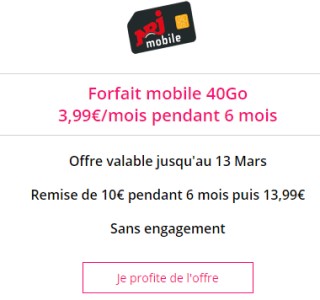 Le forfait NRJ Mobile 40Go à 9.99€ par mois en vente privée est sans engagement de durée. Cette offre est disponible uniquement sur le site showroomprivee.com jusqu’au 13 mars. Pour saisir cette promo, vous devez réaliser votre commande en ligne via la plateforme partenaire de l’opération. Sachez que seules les nouvelles souscriptions sont concernées par cette vente privée avec la possibilité de garder son numéro de mobile grâce à la portabilité.