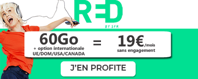 Chez RED by SFR, l'offre internationale se résume en une option que vous pouvez choisir ou non lors de la souscription du forfait 60Go ou 100Go. Cette option est proposée en ce moment, et jusqu'au 18 mars, à 5€/mois. Si vous l'ajoutez au forfait 60Go de RED by SFR, le forfait mobile vous coûtera 19€/mois.