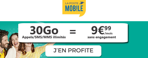 Jusqu'à ce soir, l'opérateur La Poste Mobile vous permet de profiter d'une promo forfait mobile au prix bas de 9,99€/mois et valable sans condition de durée. Le prix de ce forfait mobile ne changera pas au delà d'iune période définie, et bien sur si vous souhaiter résilier, vous pourrez le faire à tout moment car il s'agit d'un forfait sans engagement. Cet abonnement offre un volume internet de 30Go disponible en 4G depuis la France métropolitaine.