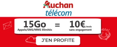 Chez Auchan l'offre est plutôt simple avec une mensualité à prix rond. En effet, pour 10€/mois, l'opérateur vous propose un forfait mobile avec 15Go de 4G. Fait rare chez, Auchan Télécom, le prix ne changera ni au bout de 6 mois, ni après la première année. Si vous souhaitez un forfait sans engagement avec les communications illimités et un petit prix, cette offre devrait vous convenir. Vous pouvez en profiter jusqu'au 13 avril 2020.