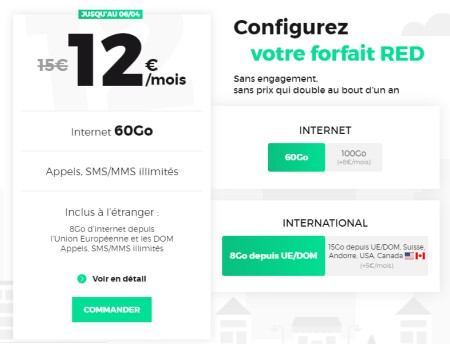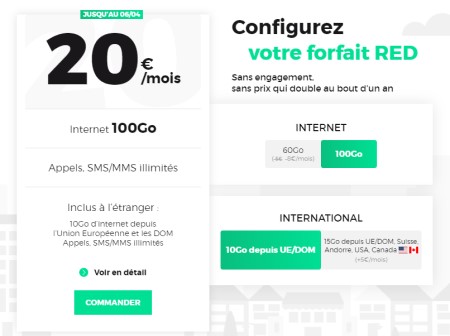 Pour les plus gourmands de data, RED offre la possibilité à ses abonnés de booster à tout moment la data en France mais aussi à l'étranger. Pour 8€ de plus par mois soit à 20€ par mois, les abonnés profitent d'une enveloppe finale de 100Go en France et de 10Go depuis l'Union Européenne et les DOM. Pour les voyageurs, sachez que l'opérateur met à disposition une option sans engagement à 5€ par mois qui permet de bénéficier de 15Go de data en Europe, DOM, Suisse, Andorre, USA et Canada. Cette option data à l'internationale est proposée avec les deux formules RED 60Go ou 100Go.
