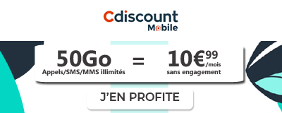 Autre promo, le forfait Cdiscount en série limitée à 10,99€/mois jusqu'au 21 avril. Avec cet abonnement, vous profitez des appels, SMS et MMS illimités depuis la France métropolitaine, l'UE et les DOM. Le volume Web de 50Go est utilisable jusqu'en 4G en France et pour vos usages Internet depuis l'Europe et les DOM, l'opérateur octroie 3Go par mois.
