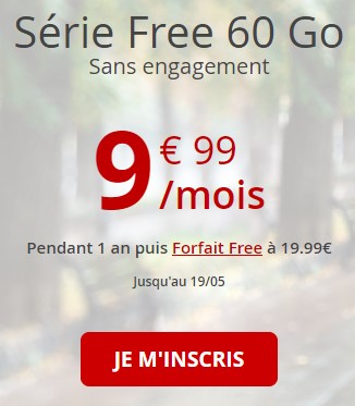 Jusqu'à minuit, le 19 mai 2020, Free mobile propose une promo forfait mobile. Cette offre est proposée à 9,99€/mois la première année avant d'évoluer vers un nouveau forfait Free. En effet, à partir de la deuxième année Free vous fera automatiquement bénéficier de son forfait 100Go à 19,99€/mois (ou 15,99€/mois pour les abonnés Freebox). Si vous ne souhaitez pas bénéficier de cette évolution, vous pourrez résilier car c'est un forfait sans engagement.